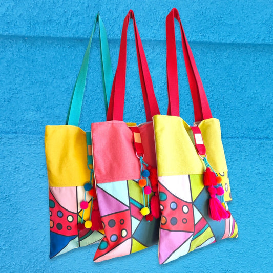Seguimos con los colores alegres , con cómodos totes, con diseños propios impresos y confeccionados en lona y sarga de algodón.