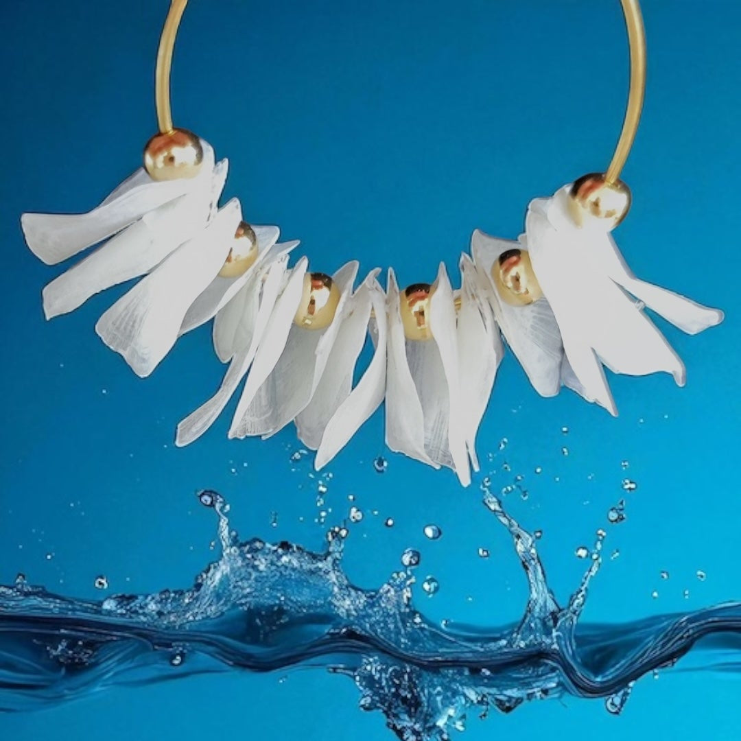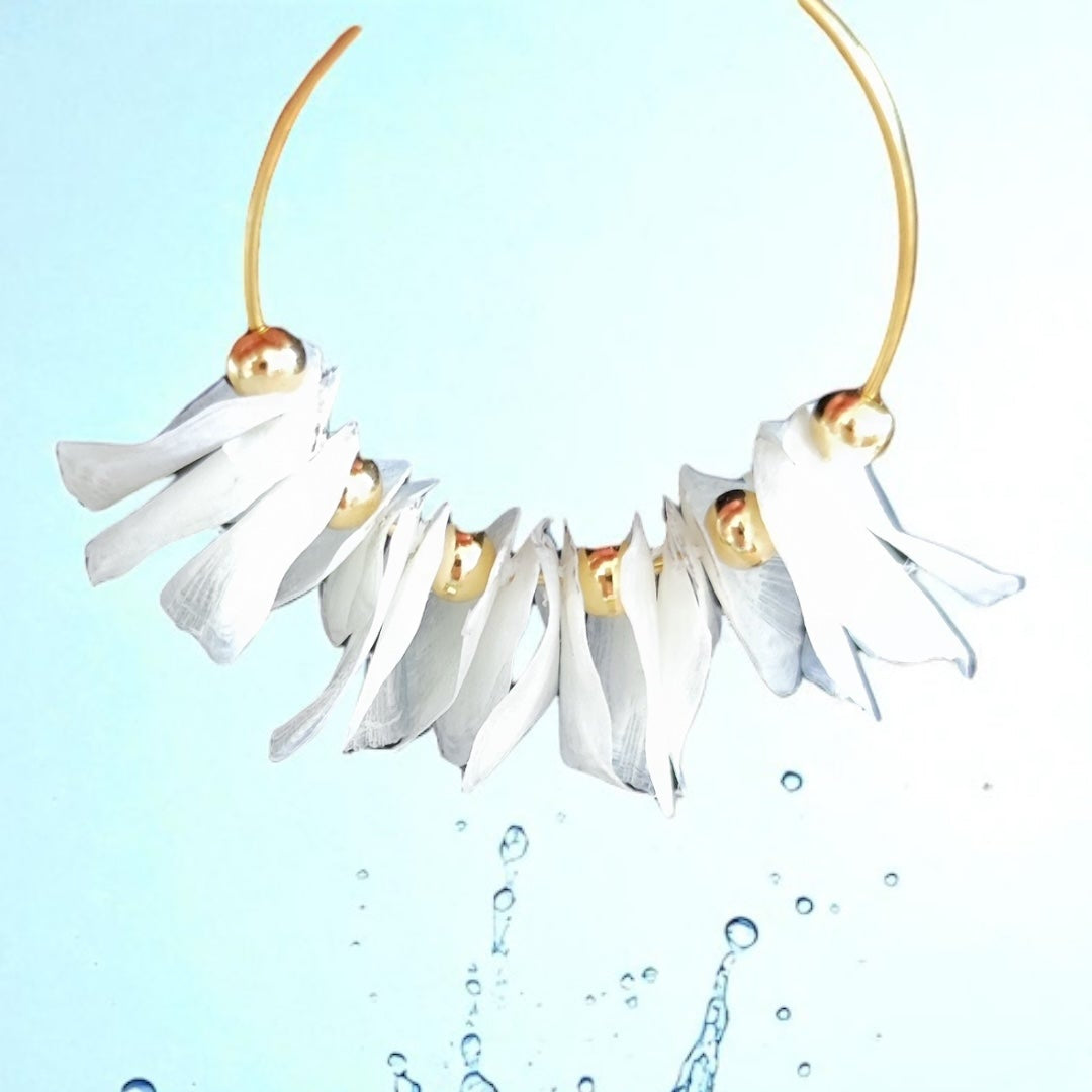 Escamas de pescado tratadas y engarzadas en aros de acero inoxidable de 3cms. de diámetro.