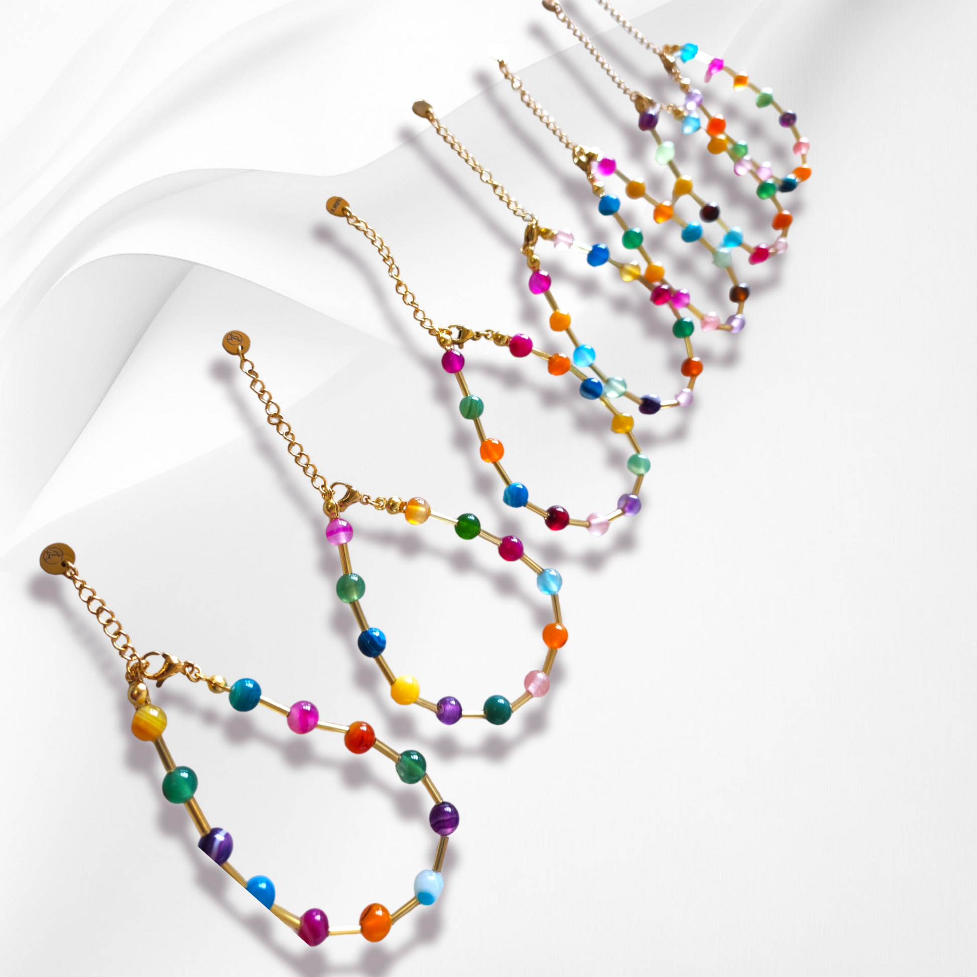 Realizada con ágatas de colores y mostacilla ,elástica ,regulable y cierre de acero.